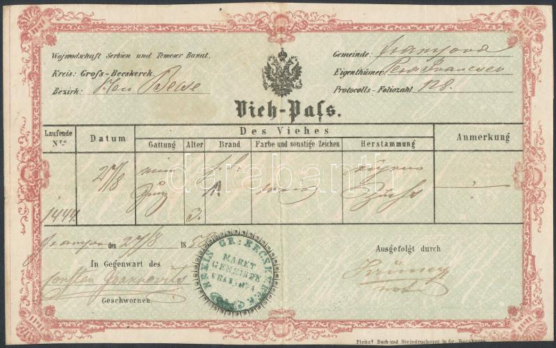 1858 Pancsova, német nyelvű marhalevél, községi bélyegzővel