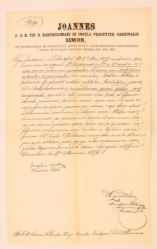 https://www.darabanth.com/en/281-Online-auction/281.0/Other-collectibles/Documents~16/1876-Simor-Janos1813-1891-esztergomi-ersek-vikariusa-altal-alairt-latin-nyelvu-okmany-hid~II1451305