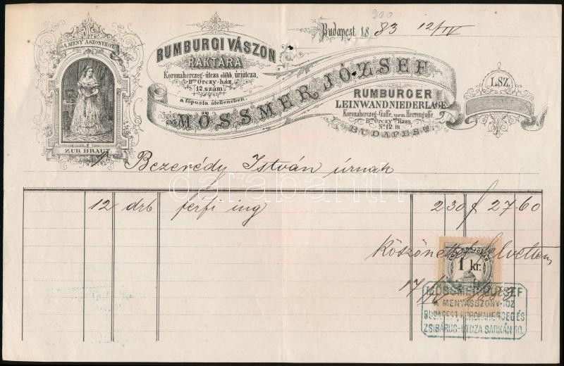 1883 Budapest, Koronaherceg utca 12. Mössmer József rumburgi vászonraktára a 'Menyasszonyhoz'. Számla díszes fejléccel, 1 kr okmánybélyeggel