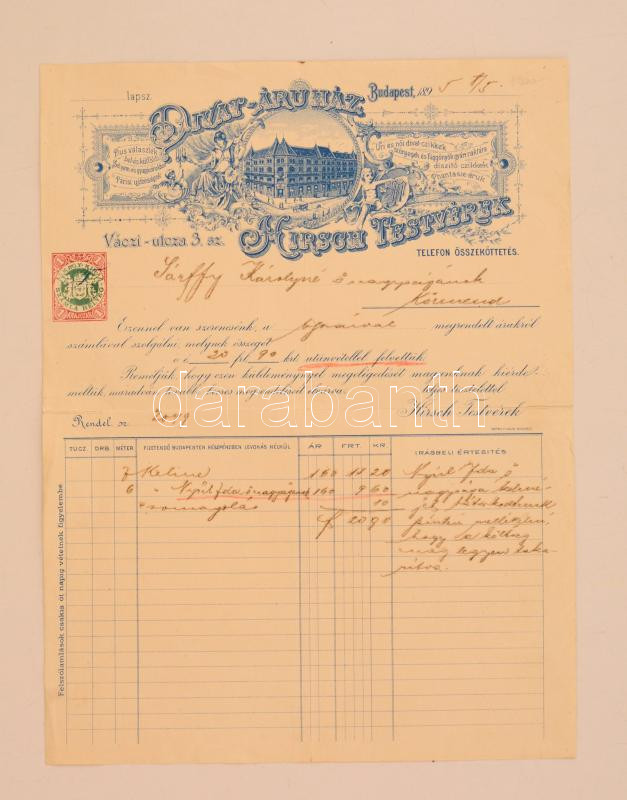 1895 Budapest, Váci utca 3. a Hirsch testvérek divatáruháza. Számla dí...
