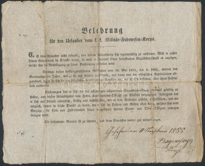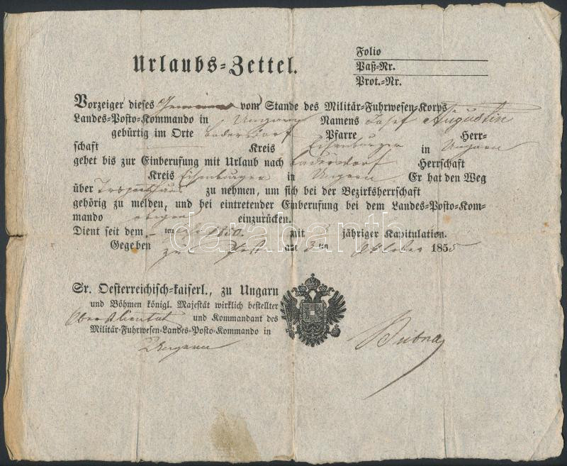 1855 Leszerelt katona úti cédulája / Urlaubszettel (passport) of disa...