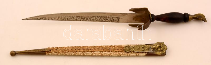 Dekoratív, fa-réz markolatú dísztőr, díszes hüvellyel, pengehossz: 31,5 cm, teljes hossz: 47 cm