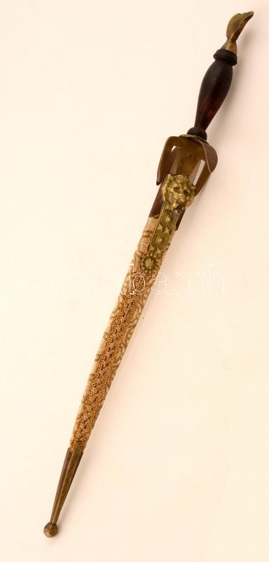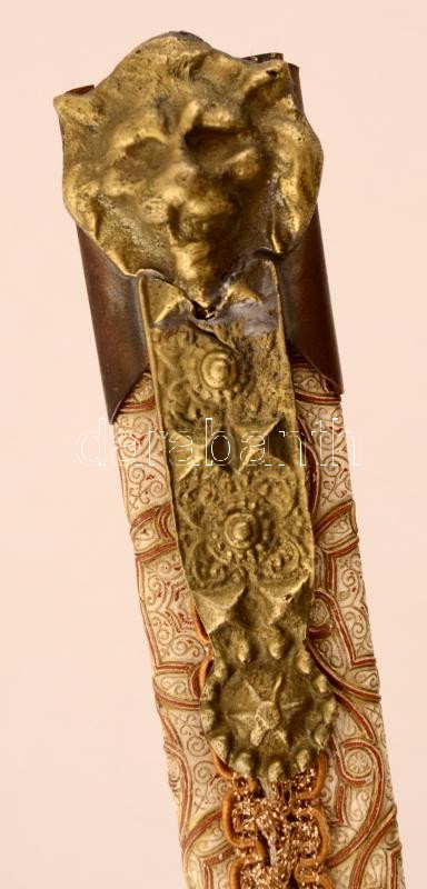 Dekoratív, fa-réz markolatú dísztőr, díszes hüvellyel, pengehossz: 31,...