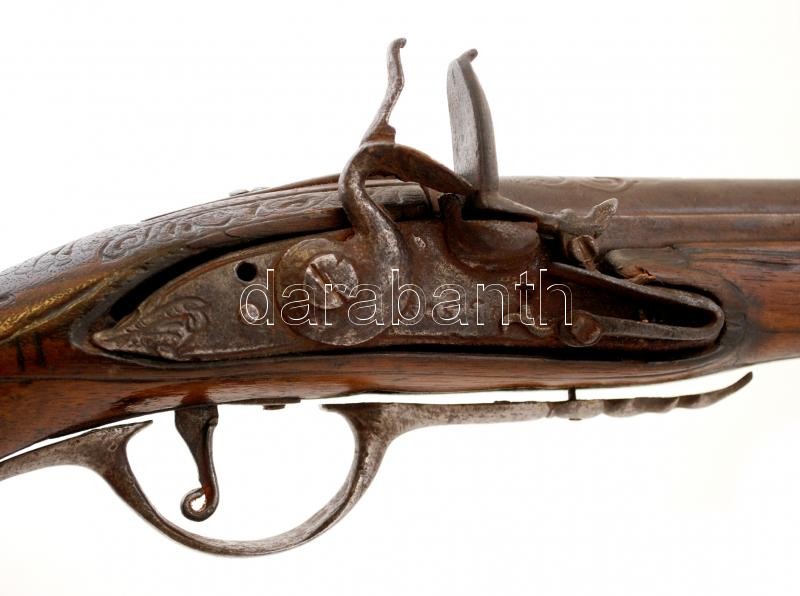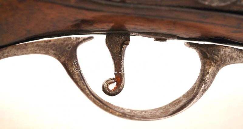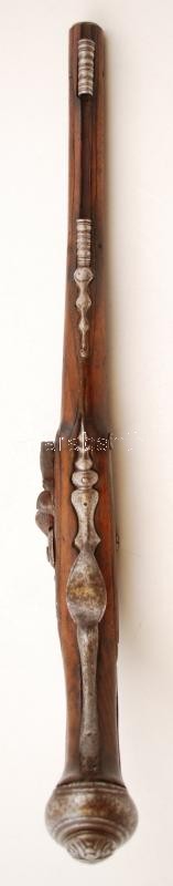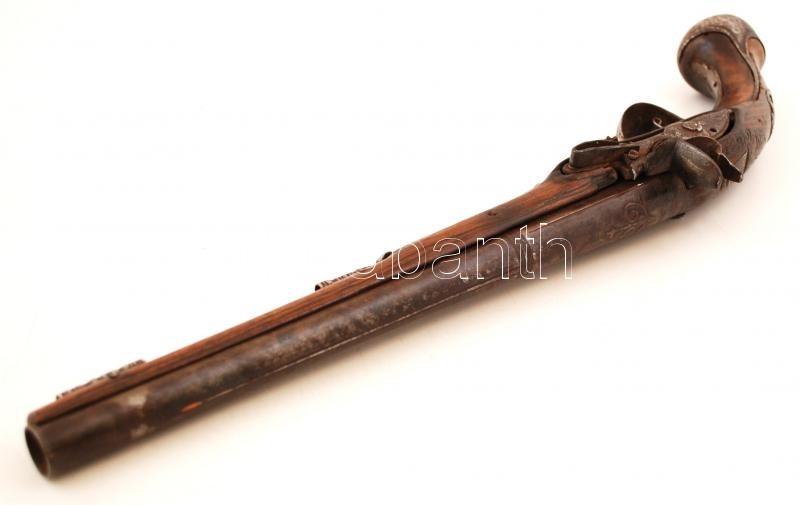Description: cca 17-18. sz. Ütőkakasos, elöltöltős pisztoly, hatástalanítva, több helyütt rozsdás, tisztításra szorul, tömőpálca nélkül / Vintagte pistol deactivated, rusty, needs cleaning: 48,5 cm