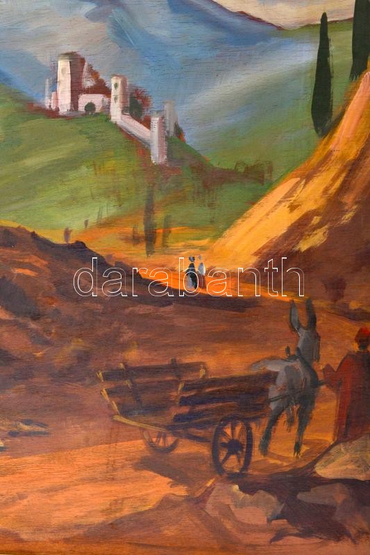 MCP jelzéssel: Város a hegyen. Olaj, falemez, keretben, 60×80 cm
