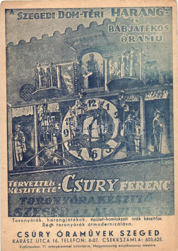 Szegedi Dóm téri Harang és Bábjátékos óramű, Csúry Óraművek reklámlapja / Hungarian clock tower work advertisement postcard