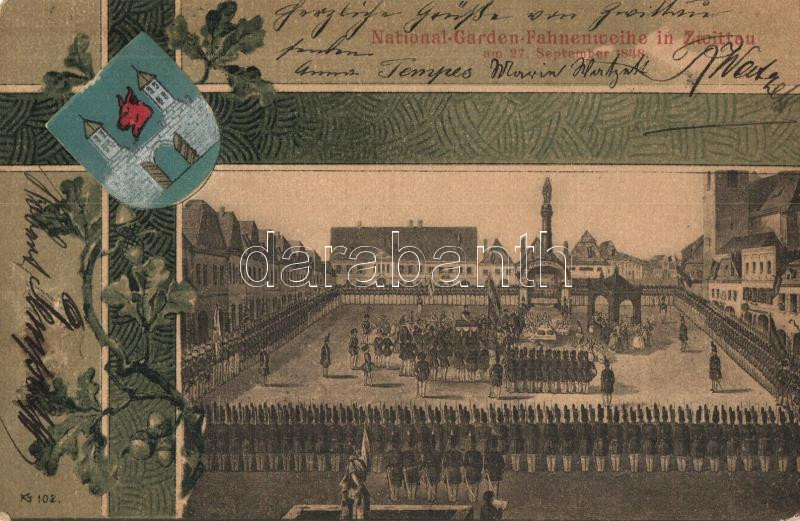 Svitavy, Zwittau; National-Garden-Fahnenweihe am 1848 / consecration of the flag, coat of arms, floral, litho