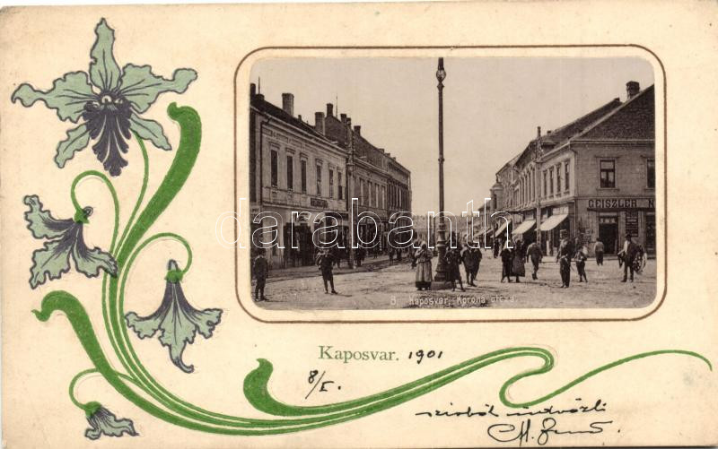 Kaposvár, Korona utca, Geiszler kereskedése; Emb. Art Nouveau floral litho; Gerő Zsigmond kiadása (r)