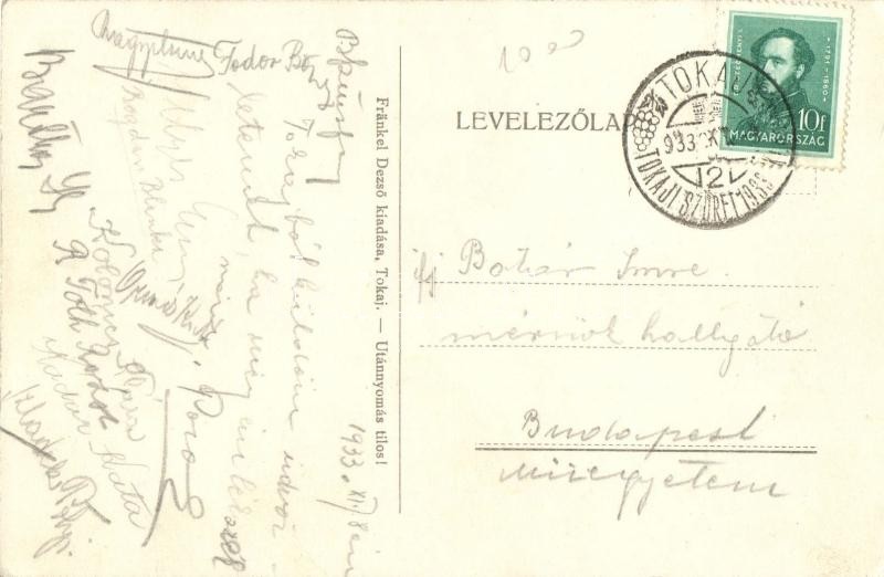 Tokaj, Erzsébet híd a Tisza folyón, kiadja Frankel Dezső, 'Tokaji Szüret 1933' So. Stpl. (EK)