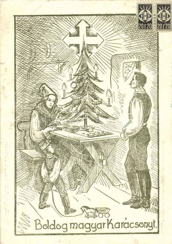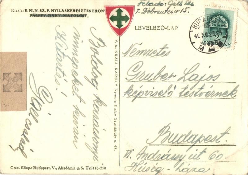 'Boldog magyar Karácsonyt' Nyilaskeresztes Párt propaganda képeslapja, nyilaskeresztes bélyegekkel, Gruber Lajos képviselőnek címezve / Christmas, Hungarian Arrow Cross Party propaganda card (kis szakadás / small tear)