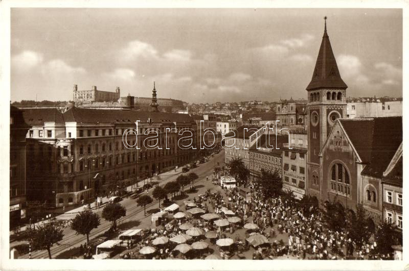 Pozsony, Pressburg, Bratislava; Andrej Hlinku tér, vár, piac, hotel, Berghoffer reklám / square, castle, market, advertisement