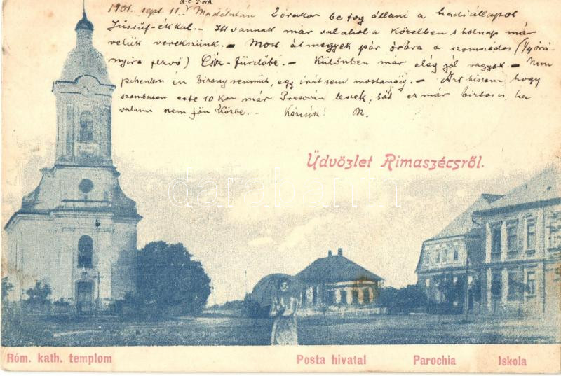 Rimaszécs, Rimavska Sec; Római katolikus templom, Posta hivatal, parókia, Iskola / church, post office, school, parish