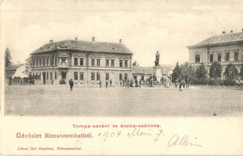 Rimaszombat, Rimavská Sobota; Tompa szobor, Stolcz-szálloda, kávéház, Lévai László kiadása / statue, hotel, café (EK)