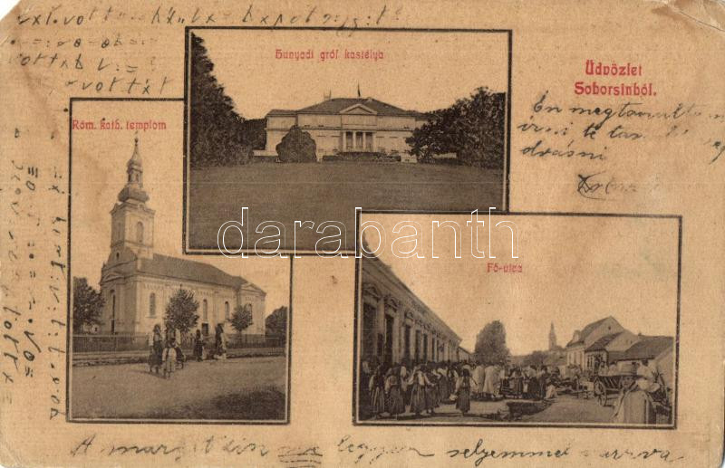 Soborsin, Savarsin; Hunyadi gróf kastélya, Fő utca, piac, Római katolikus templom, W. L. 3099-3101-3. / main street, market, castle, church (EM)