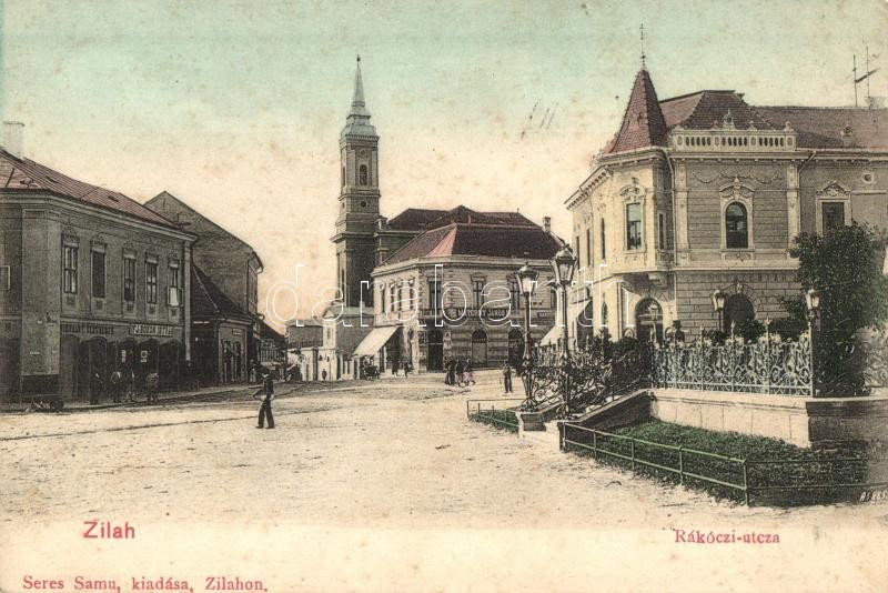 Zilah, Zalau; Rákóczi utca, Ifj. Bokor István és Materny János üzlete / street view, shops