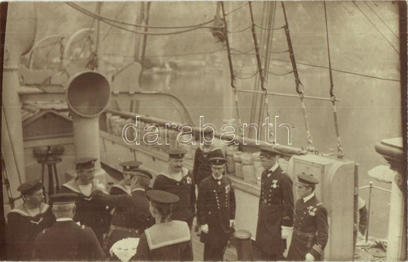 Description: SMS Panther, a K. u. K. haditengerészet torpedócirkálója, vitézségi érmek kiosztása a fedélzeten / Austro-Hungarian Navy torpedo cruiser, medal award ceremony