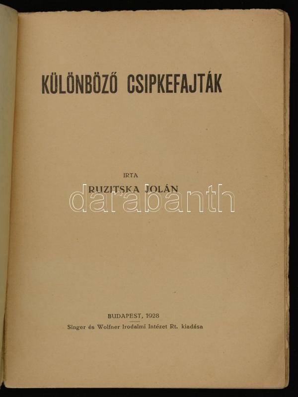 Ruzitska Jolán: Különböző Csipkefajták. Kis Könyvek. Budapest, 1928, S... https://www.darabanth.com/en/282-Online-auction/282.0/Books/Books-Architecture-Art~42/Ruzitska-Jolan-Kulonbozo-Csipkefajtak-Kis-Konyvek-Budapest-1928-Singer-es-Wolfner-Iroda~II1457544