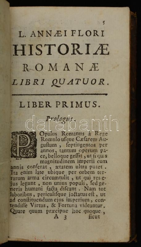Description: Lucius Annaeus Florus: Rerum Romanarum libri IV. Passau, 1721, ex typografia seminarii. Kicsit kopott bőrkötésben, néhol kicsit foltos lapokkal, egyébként jó állapotban.