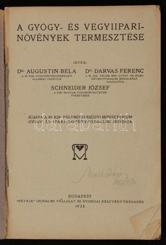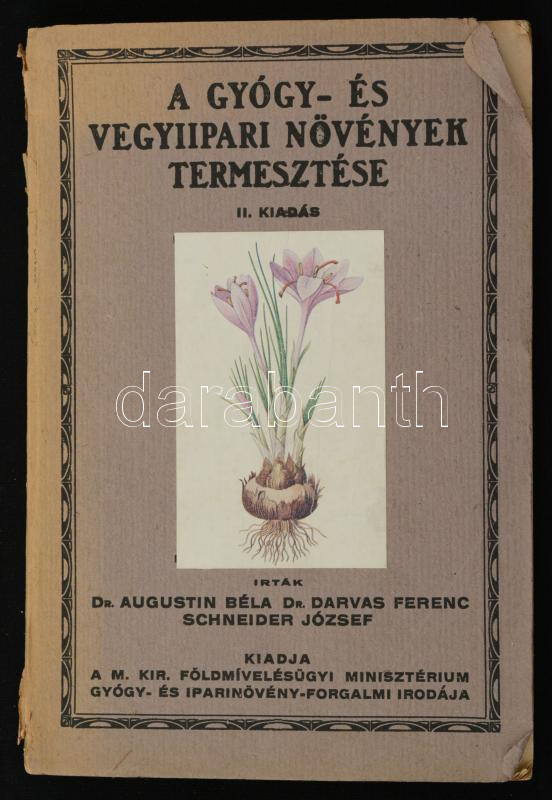 Dr. Augustin Béla, Dr. Darvas Ferenc, Schneider József: A gyógy-, és vegyiipari növények termesztése. Bp., 1922, M. Kir. Földmívelésügyi Minisztérium Gyógy-, és Iparinövény-forgalmi Irodája, "Pátria" Irodalmi Vállalat és Nyomdai Rt. II. kiadás. Kiadói papírkötés, szakadozott papírborítóval, szövegközti fekete-fehér illusztrációkkal.