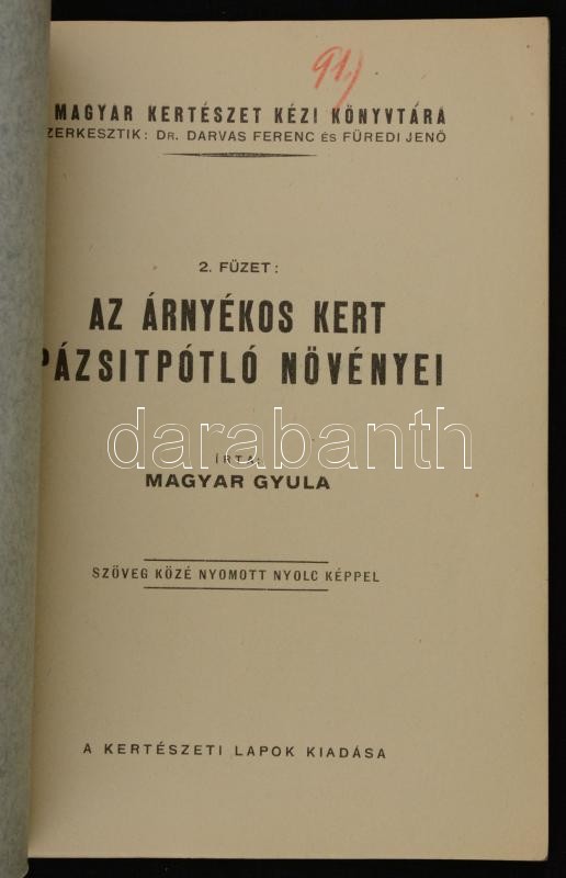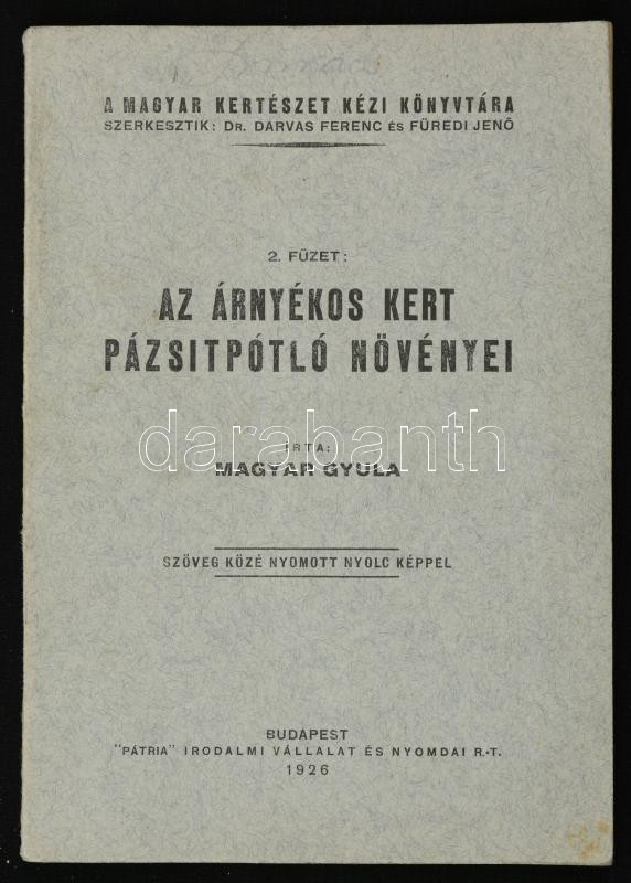 Description: Magyar Gyula: Az árnyékos kert pázsitpotló növényei. Magyar kertészet kézi könyvtára 2. füzet. Bp., 1926, "Pátria" Irodalmi Vállalat és Nyomdai Rt. Kiadói papírkötés, szövegközti fekete-fehér illusztrációkkal.