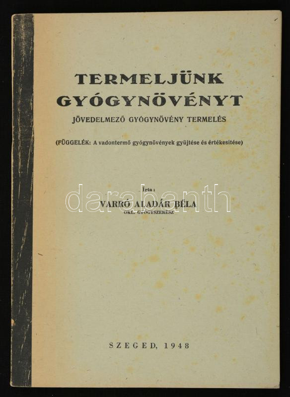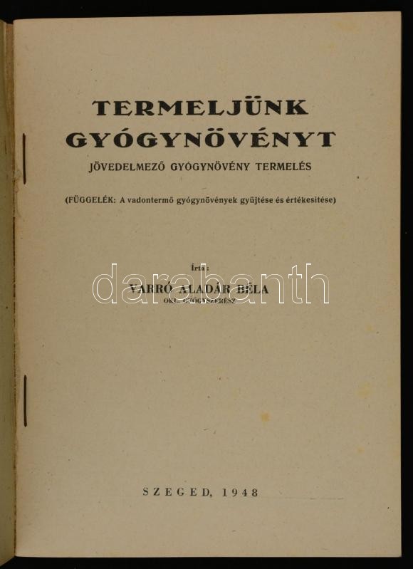 Varró Aladár Béla: Termeljünk gyógynövényt. Jövedelmező gyógynövény termelés. (Függelék: A vadontermő gyógynövények gyűjtése és értékesítése.) Szeged, 1948, Szukits. Kiadói papírkötés. Jó állapotban.