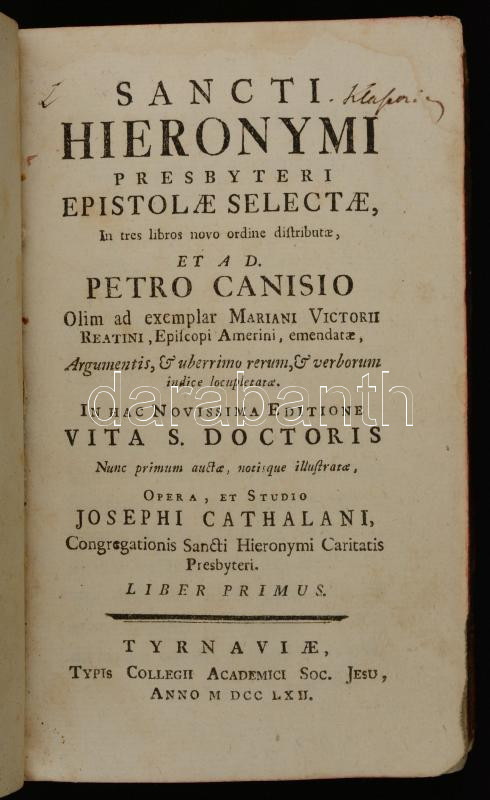 Sancti Hieronymi presbyteri epistolae selectae. 1. köt. Nagyszombat, 1... https://www.darabanth.com/en/282-Online-auction/282.0/Books/Books-Religion~37/Sancti-Hieronymi-presbyteri-epistolae-selectae-1-kot-Nagyszombat-1762-typis-collegii-academici~II1455790