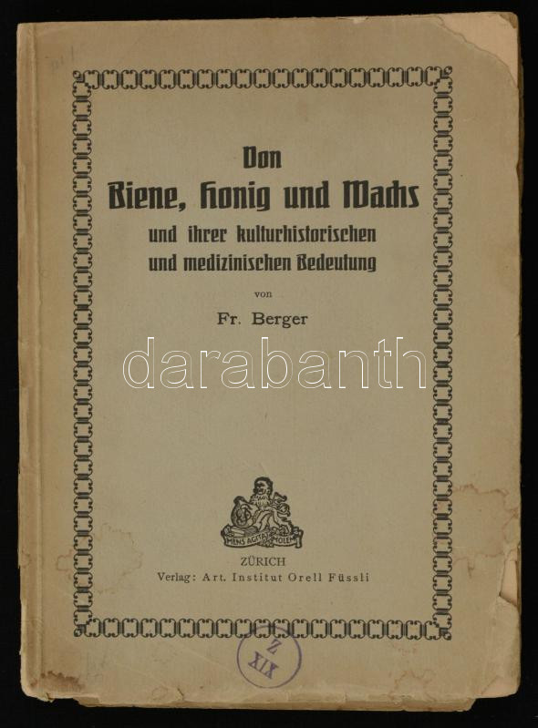 Fr. Berger: Von Biene, honig und Machs und ihrer kulturhistorischen und medizinischen Bedeutung. Zürich, 1916, Art. Institut Orell Füssli. Kiadói papírkötés, a borítója szakadozott, és a hátsó borító elvált a könyvtesttől, a gerince szakadt, hiányos, felvágatlan lapokkal.