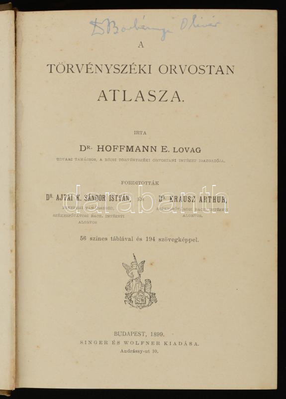 Hoffmann, E.: A törvényszéki orvostan atlasza. Bp., 1899, Singer és Wolfner. Kissé kopott vászonkötésben, gazdag, érdekes képanyaggal, jó állapotban.