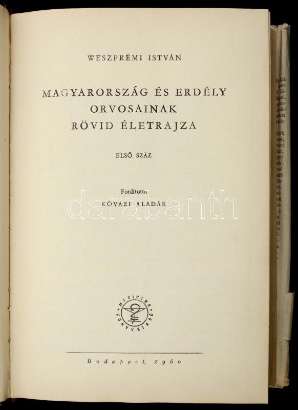 Weszprémi István: Magyarország és Erdély orvosainak rövid életrajza I. (Első száz.), Succincta Medicorum Hungariae et Transilvaniae Biographia. Ovostörténeti Könyvek - Libri Historiae Mediciae. Fordította Kővári Aladár. Budapest, 1960, Medicina, 479p. Csak 1100 példányban jelent meg! Kiadói aranyozott egészvászon kötésben, kiadói papírborítóban. A papírborító szakadozott, foltos. Színes ceruzával aláhúzások.