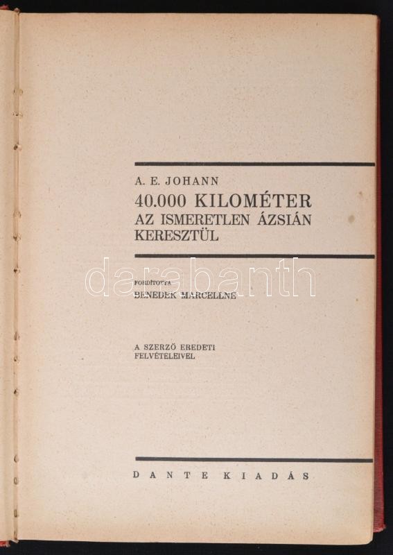A.E. Johann: 40.000 kilométer az ismeretlen Ázsián keresztül. Fordította Benedek Marcellné. A szerző eredeti felvételeivel. Bp., Dante. Kiadói egészvászon kötés, gerincnél kopott, egyébként jó állapotban.