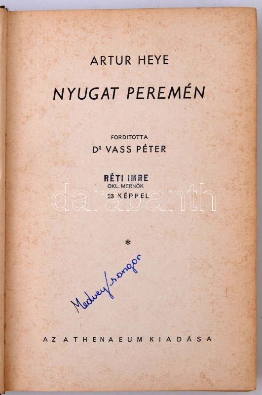 Arthur Heye: Nyugat peremén. Ismeretlen világok. Bp., é.n., Athenaeum. Kiadói kopottas, kissé foltos aranyozott egészvászon-kötésben. Néhány ceruzás bejegyzéssel.