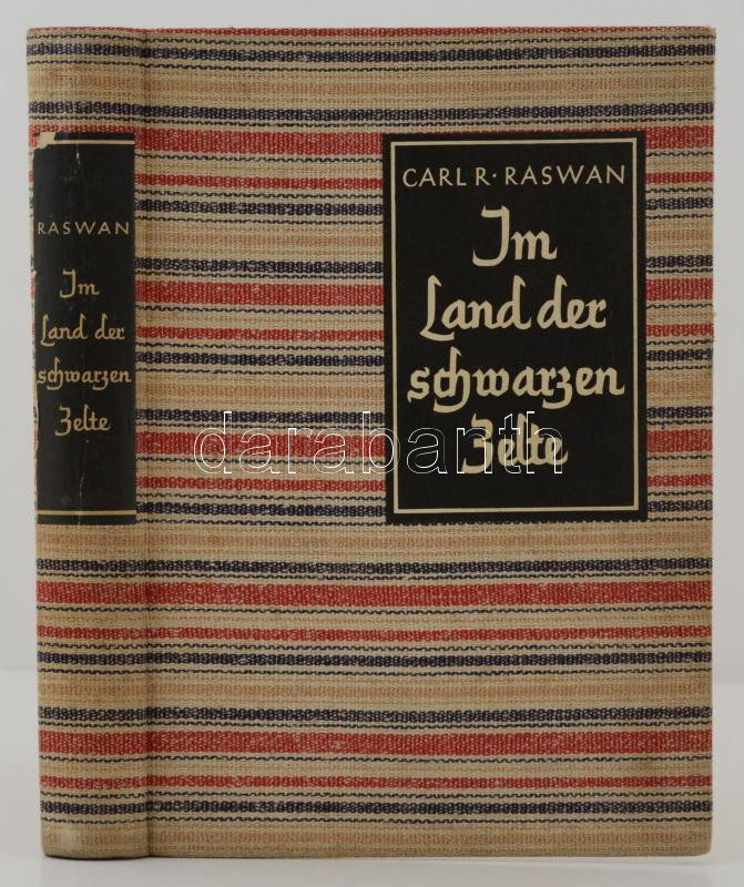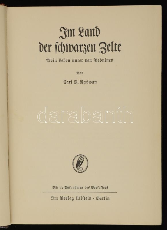 Carl R. Raswan: Im Land der Schwarzen Zelte. Mein Leben unter den Beduinen. Berlin, 1934, Ullstein. Kiadói egészvászon kötés, fekete-fehér fotókkal illusztrálva, német nyelven. Jó állapotban. / Linen-binding, in good condition, in german language.