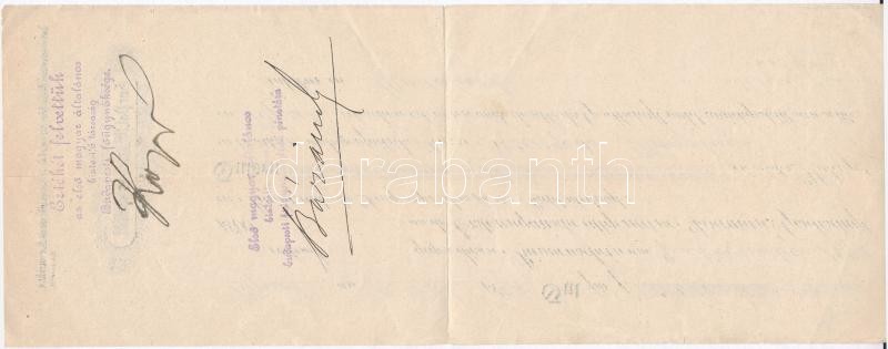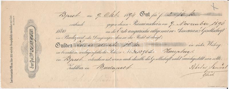 Budapest 1894. "Erste ungarische allgemeine Asseeuranz-Gesellschat (Első Magyar Általános Biztosító Társaság)" váltója, hátoldalon bélyegzésekkel T:III szakadás