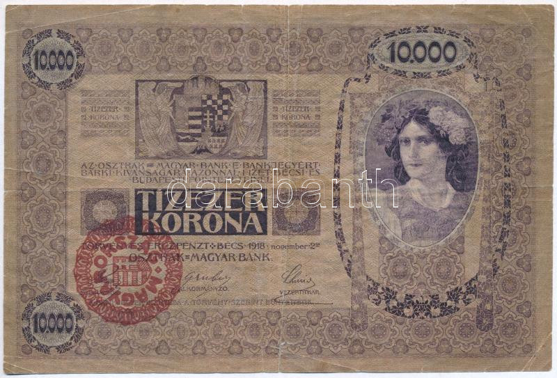 https://www.darabanth.com/en/282-Online-auction/282.0/Numismatics/Hungarian-Banknotes~300006/1918-10000K-piros-MAGYARORSZAG-felulbelyegzessel-TIII-III-szakadas-a-fuggoleges-hajtas~II1455602