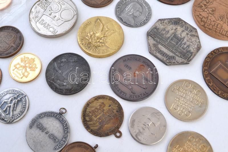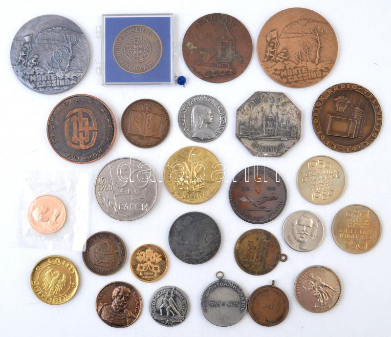 24db-os vegyes magyar és külföldi emlékérem és plakett, közte 1960. "Orion Rádió-Televízió 1913-1963" Br emlékplakett (60mm), 1989. "1956 Vértanúk emlékére - A magyar demokrata fórum" fém emlékérem (42,5mm), 1999. "Magyar Honvédség Térképészeti Hivatal 1919-1999" Br egyoldalú emlékérem (50mm) T:2,2- ragasztónyom, ü.