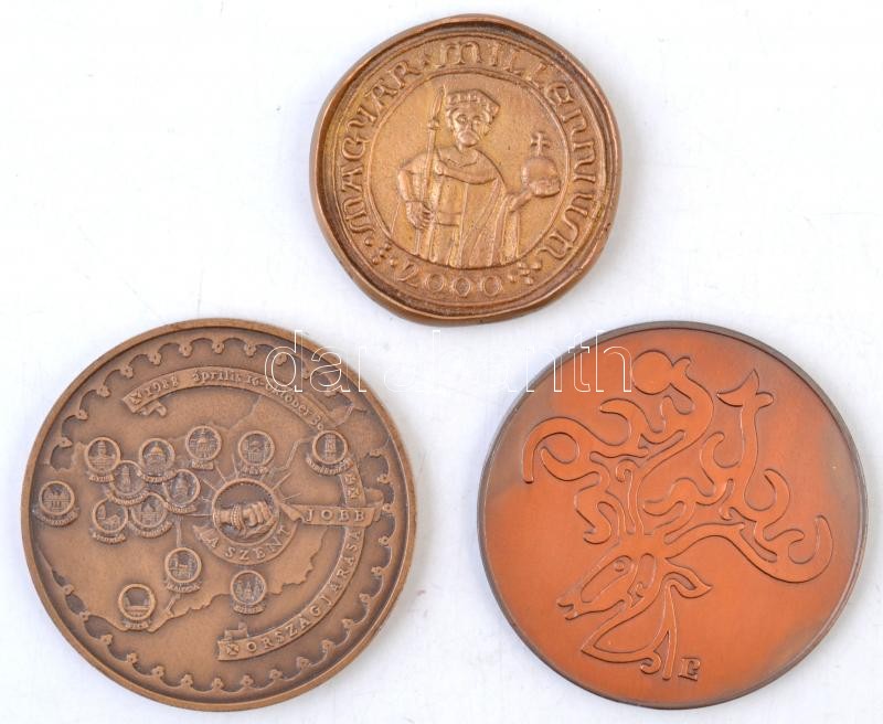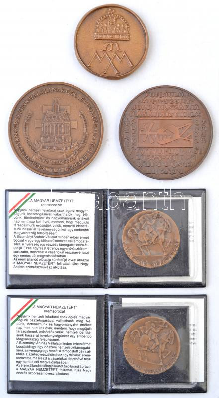 5db-os emlékérem és plakett tétel, benne "Magyar Nemzetért éremsorozat - Az erdélyi menekültekért" Br emlékérem, tanúsítvánnyal, műanyag tokban (2x), 2000. "Magyar Millenium" Br emlékérem, 1988. "Szent István halálának 950. évfordulójára" Br emlékérem (2xklf) T:1-,2