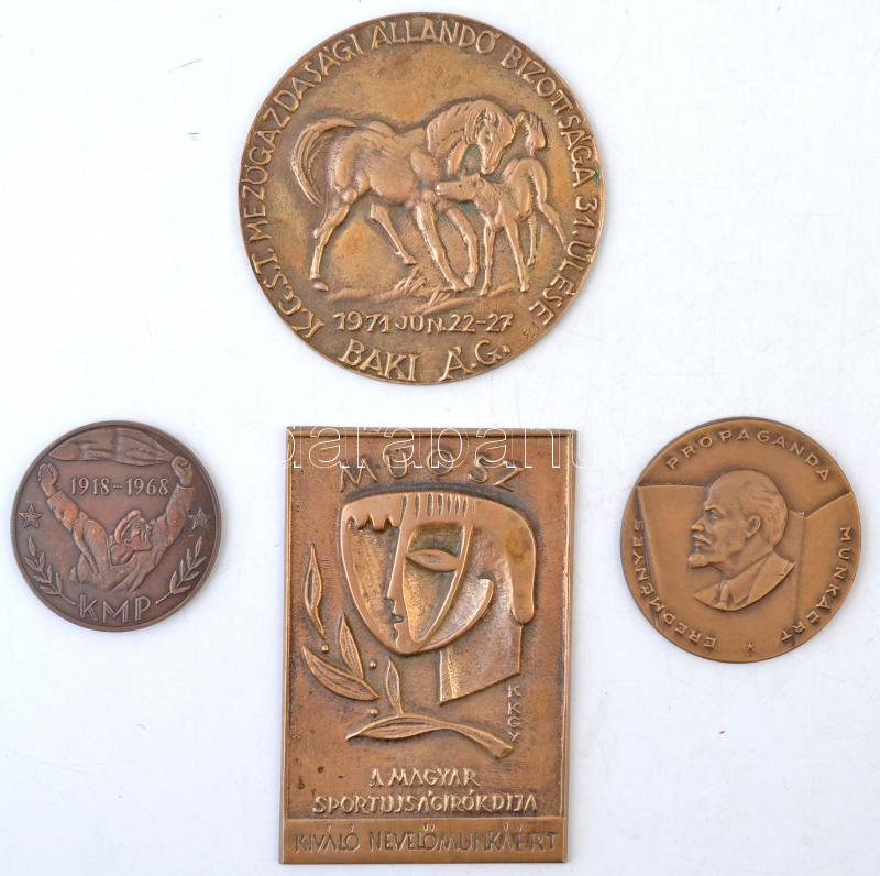 Description: 6db vegyes emlékérem és plakett az 1960-1970-es évekből: 1969. "VII. Országos Ifjúsági Bélyegkiállítás Szeged", 1968. "KMP", DN "Landler Jenő", 1971. "KGST Mezőgazdasági Állandó Bizottsága 31. ülése", DN "MÜOSZ A Magyar Sportújságírók Díja", DN "Eredményes Propaganda Munkáért" T:2 több darab hátoldalán ragasztónyom
