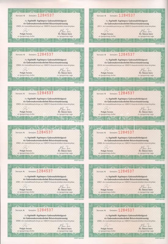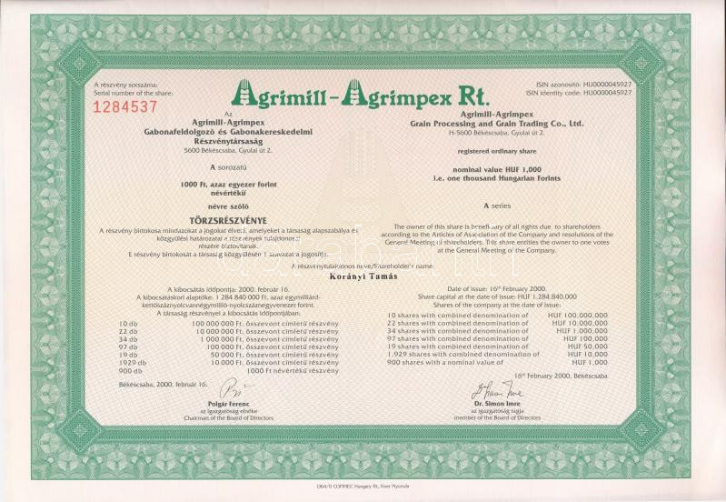Description: Békéscsaba 2000. "Agrimill-Agrimpex Rt. Gabonafeldolgozó és Gabonakereskedelmi Részvénytársaság" törzsrészvénye 1000Ft-ról, magyar és angol nyelven, teljes szelvényívvel T:I-