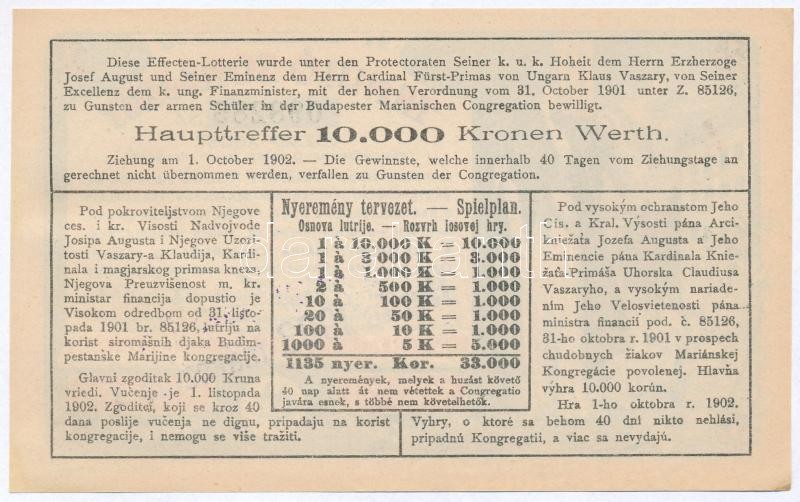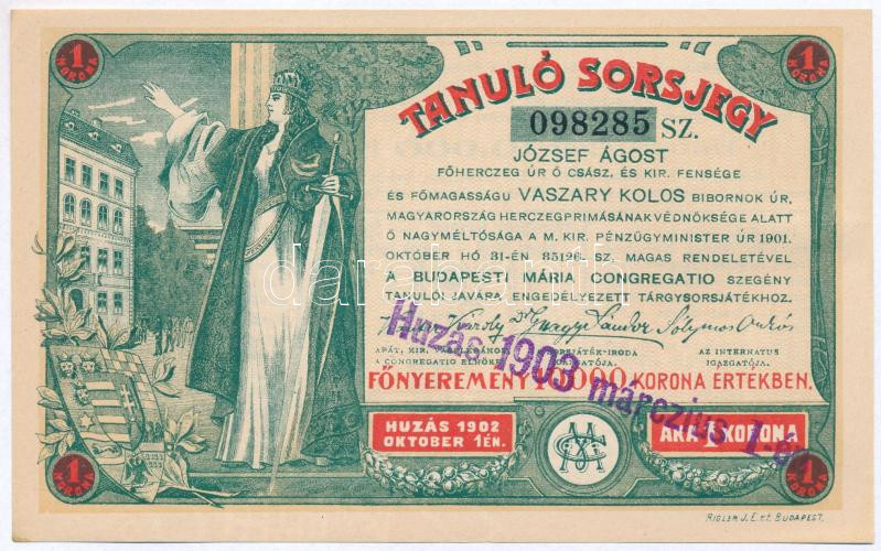 Budapest 1903. "Tanuló Sorsjegy" 1K értékben, felülbélyegzés...