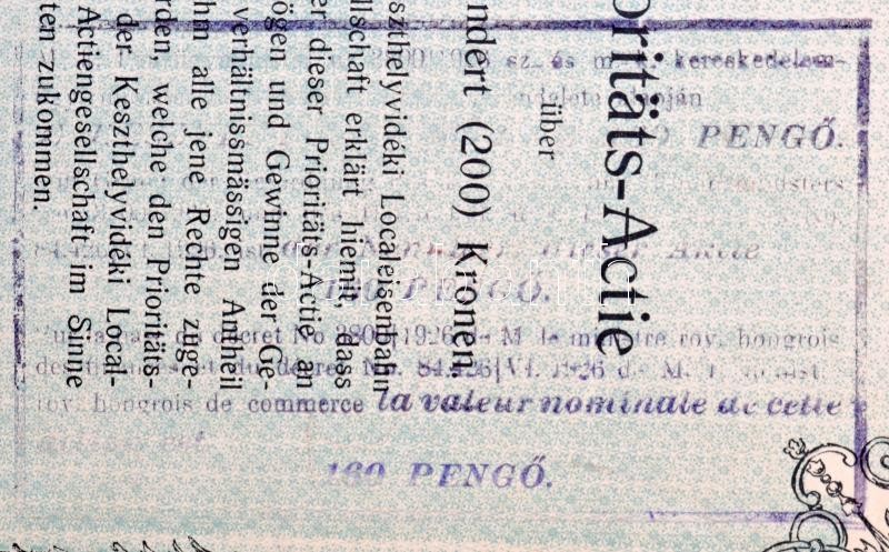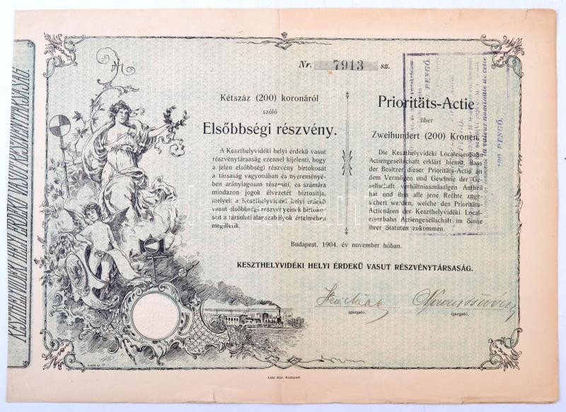 Description: Budapest 1904. "Keszthelyvidéki Helyi Érdekü Vasut Részvénytársaság" elsőbbségi részvénye 200K-ról, magyar és német nyelven, szárazpecséttel és bélyegzéssel T:III hátoldalán gyermekrajz