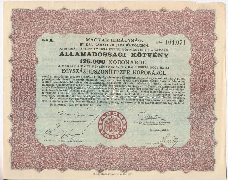 Budapest 1925. "Magyar Királyság 5%-kal kamatozó Járadékkölcsön Á... https://www.darabanth.com/en/282-Online-auction/282.0/Numismatics/Shares-and-Tickets~300004/Budapest-1925-Magyar-Kiralysag-525-kal-kamatozo-Jaradekkolcson-Allamadossagi-Kotveny-1~II1453161
