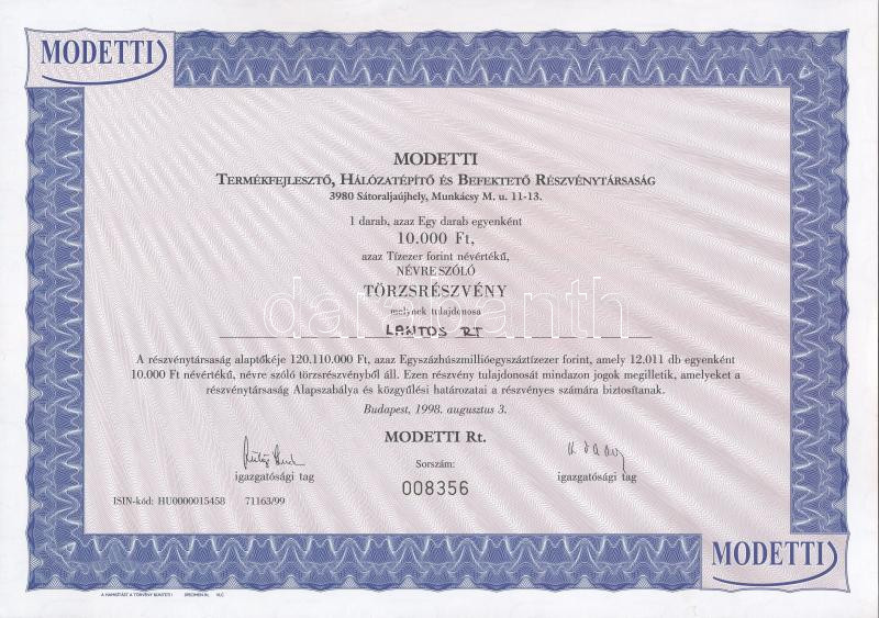 Budapest 1998. "Modetti Termékfejlesztő, Hálózatépítő és Befektető Részvénytársaság" törzsrészvénye 10.000Ft-ról T:I-