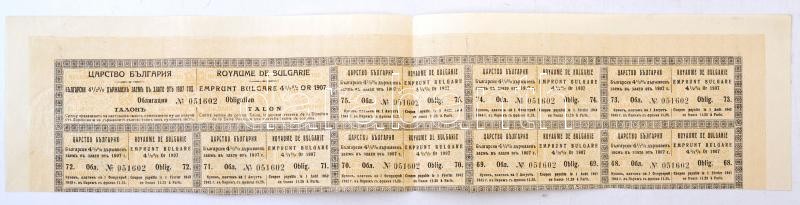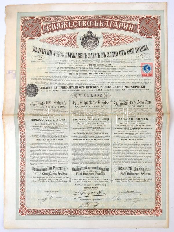 Bulgária / Szófia 1907. "4 1/2°-os Arany Kölcsön" kötvény 50... https://www.darabanth.com/en/282-Online-auction/282.0/Numismatics/Shares-and-Tickets~300004/Bulgaria-Szofia-1907-4-12C2B0-os-Arany-Kolcson-kotveny-500Fr-rol-szelvenyekkel-es-bel~II1454286