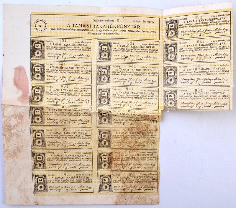 Tamási 1897. "A Tamási Takarékpénztár" részvénye 100K-ról szárazpecséttel, felülbélyegzéssel, szelvényekkel, a 30041. számú tétel sorszámkövető párja T:III