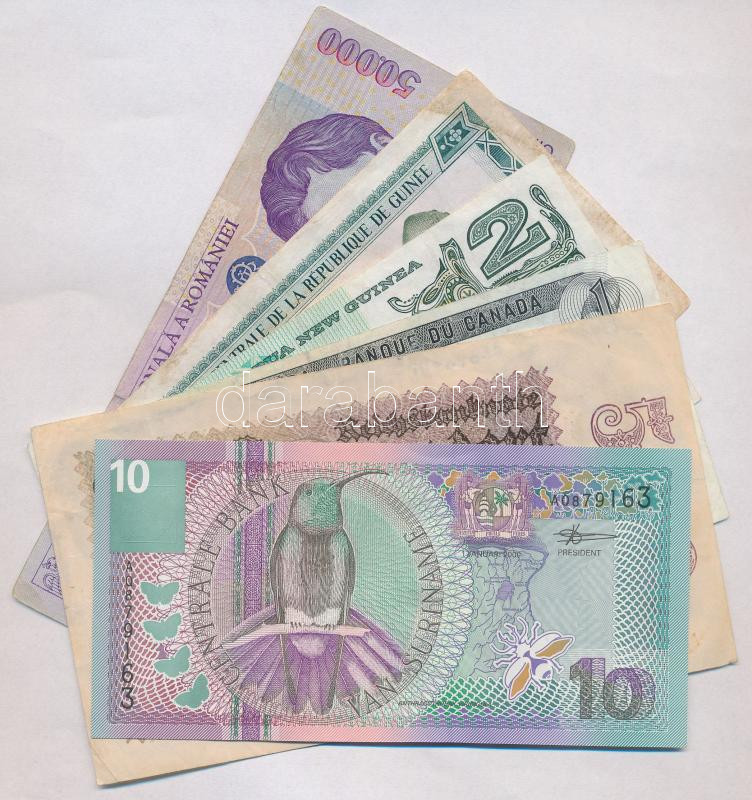 https://www.darabanth.com/en/282-Online-auction/282.0/Numismatics/Worldwide-banknotes~300011/Vegyes-Kanada-1973-1USD-plus-Suriname-2000-10G-plus-Romania-2000-50000L-plus-Guinea-1980-25S-plus-Papua-U~II1454270