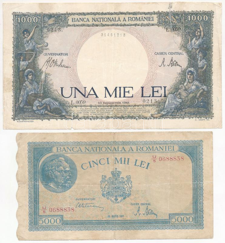 Vegyes: Románia 1941. 1000L + 1945. 5000L + Német Birodalom 1904. 5M +... https://www.darabanth.com/en/282-Online-auction/282.0/Numismatics/Worldwide-banknotes~300011/Vegyes-Romania-1941-1000L-plus-1945-5000L-plus-Nemet-Birodalom-1904-5M-plus-Nemetorszag-Weimari-Ko~II1454022