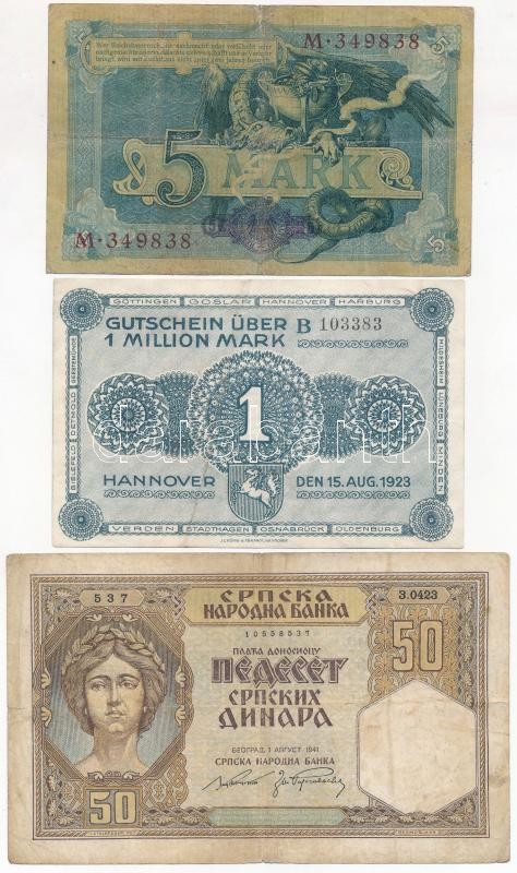 Description: Vegyes: Románia 1941. 1000L + 1945. 5000L + Német Birodalom 1904. 5M + Németország / Weimari Köztársaság / Hannover 1923. 1.000.000M + Szerbia / Német Megszállás 1941. 50D T:III-IV ragasztás, tűly.