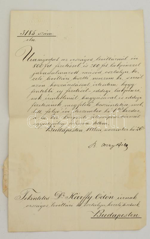 1888 Dr. Kárffy Ödön történész, levéltáros fizetésemelési értesítése O...