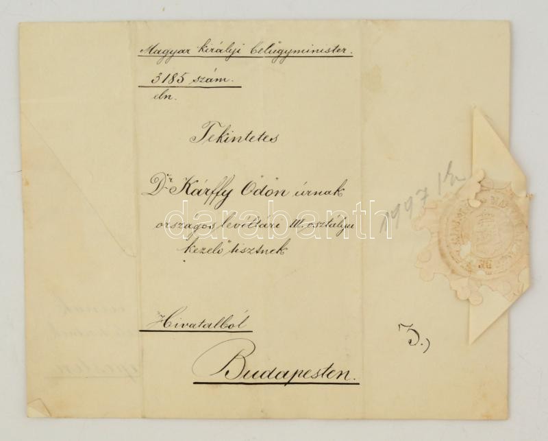 1888 Dr. Kárffy Ödön történész, levéltáros fizetésemelési értesítése Orczy Bélának (1822-1917), a Tisza Kálmán-kormány belügyminiszterének (1887-1889) aláírásával, szárazbélyeggel, okmánybélyeggel.