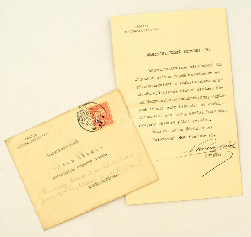 1908 Kenessey Béla (1858-1918) erdélyi református püspök, fÅ‘rendiházi tag aláÃrt levele, Szél Kálmán nagyszalontai esperesnek melyben megköszöni megválasztásához küldött gratulációját